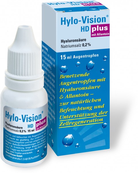 Hylo-Vision® HD plus 15 ml Augentropfen enthalten 0,2 % hochgereinigtes Natriumhyaluronat und Allantoin in Phosphat-gepufferter Kochsalzlösung mit Polyhexanid, einem sanften Konservierungsmittel. Natriumhyaluronat ist eine natürliche Substanz, die auch im menschlichen Auge vorkommt. Das ein gesetzte Natriumhyaluronat ist nicht tierischen Ursprungs, sondern wird fermentativ gewonnen. Allantoin ist ein pflanzlicher Wirkstoff, der beispielsweise aus der Pflanze Beinwell gewonnen wird. Der Ophtioleninhalt wurde durch Filtration sterilisiert; die Keimfreiheit ist nur bei unversehrter Ophtiole gewährleistet.