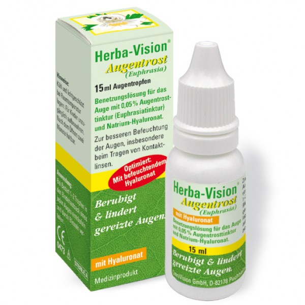 Herba-Vision® Augentrost Augentropfen bringen Linderung und beruhigen bei gereizten Augen, verursacht durch das Tragen von Kontaktlinsen, den Aufenthalt in verrauchten Räumen, langandauernde Computerarbeit oder Belastung durch allgemeine Umwelteinflüsse, wie Staubpartikel, Pollen usw.